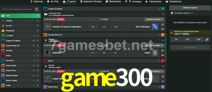 O game300 oferece uma grande seleção de opções de apostas em e-sports com probabilidades competitivas